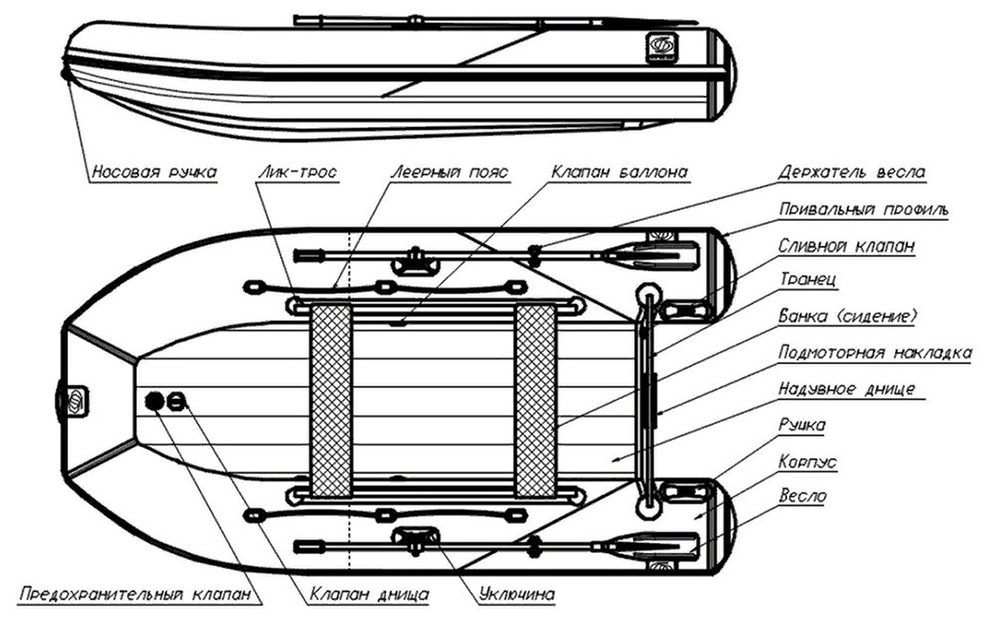 Конструкция днища лодки в зависимости от модели может быть различной: плоская панель ПВХ или натяжное «V – образное» дно с надувным килем и сборным пайолом из водостойкой фанеры, имеющей покрытие противоскольжения.